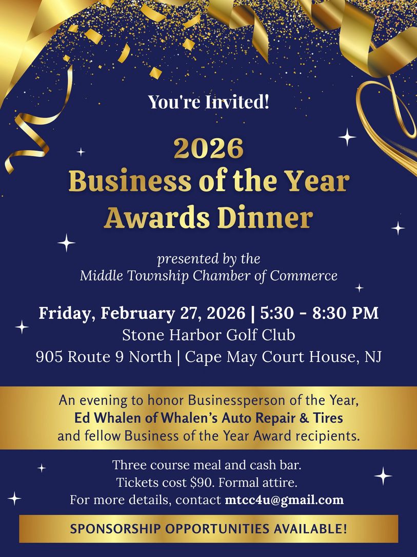 We hope to see you on February 27 at Stone Harbor Golf Club as we honor Businessperson of the Year, Ed Whalen of Whalen's Auto Repair & Tires and celebrate other Middle Township Business of the Year Award recipients!